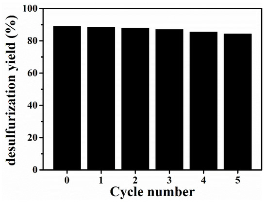 Regeneration and low-cost recycling were very important factors during the industrialization of extractants. To achieve the regeneration of [BMIM]FeCl4, organic solvent cyclohexane was used to separate DBDS from the [BMIM]FeCl4. The desulfurization efficiency of recycled [BMIM]FeCl4 is displayed in Figure 11. The desulfurization efficiency of [BMIM]FeCl4 remained at 85.39% after five cycles. Thereby, [BMIM]FeCl4 presented with good regeneration performance.