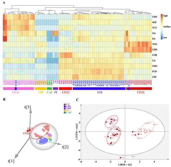 Clustering heatmap analysis (A) based on the 12 observed constituents’ contents in CF (35 batches), CFI (28 batches), TBF (6 batches), PF (3 batches), and CAF (3 batches), discrimination of CF, CFI, TBF, PF, and CAF by PCA (B), and discrimination of the whole fruit and the flesh of CF by OPLS-DA (C).