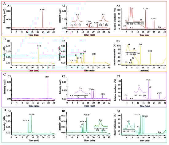 Methanol was purchased from Sigma-Aldrich Inc. (St. Louis, MO, USA). Formic acid was bought from Shanghai Aladdin Bio-Chem Technology Co., Ltd. (Shanghai, China). Dimethyl sulfoxide (DMSO) was provided by Tianjin Damao Chemical Reagent Factory (Tianjin, China). The water used in this study was purchased from Guangzhou Watson’s Food & Beverage Co., Ltd. (Guangzhou, China). GA, PUN, COR, TGG, CHG, CHI, and EA, all with purities above 98%, were obtained from Shanghai Yuanye Biotechnology Co., Ltd. (Shanghai, China). CA, 4GS, 3GS, CHN, and UM5 were isolated and prepared in our laboratory, and their purity was verified to be greater than 98% by UPLC-UV. The structures of the focused compounds are displayed in Supplementary Figure S9.