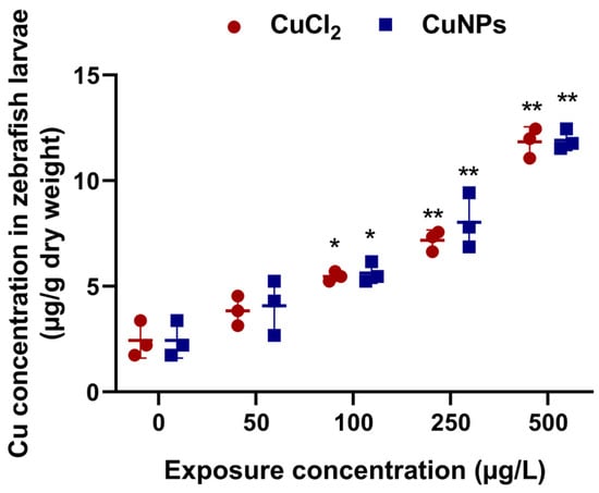 Cu concentration (µg/g dry weight) in the zebrafish embryos exposed to CuCl2 and CuNPs for 96 h. The experiment was performed in triplicate with N = 30 for each treatment. Data are mean ± SD. * p < 0.05, ** p < 0.01 versus the control.