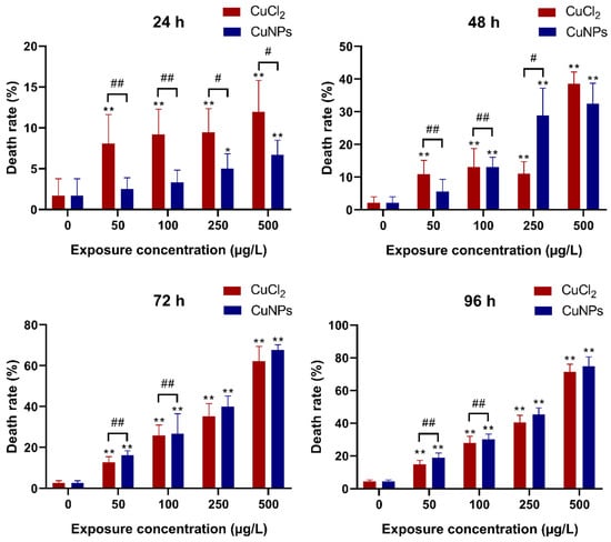 Death rate (%) of zebrafish embryos after treatment with different concentrations of CuCl2 and CuNPs for 96 h. Data are mean ± SD, N = 180. * Denotes significant difference versus the control (* p < 0.05, ** p < 0.01). # Denotes significant difference between CuCl2 and CuNPs groups (# p < 0.05, ## p < 0.01).