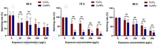 Hatching rate (%) of zebrafish embryos after treatment with different concentrations of CuCl2 and CuNPs for 96 h. Data are mean ± SD, N = 180. * Denotes significant difference versus the control (* p < 0.05, ** p < 0.01). ## Denotes significant difference between CuCl2 and CuNPs groups (p < 0.01).