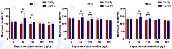 Heart rate (%) of zebrafish embryos after treatment with different concentrations of CuCl2 and CuNPs for 96 h. Data are mean ± SD, N = 60. * Denotes significant difference versus the control (* p < 0.05, ** p < 0.01). ## Denotes significant difference between CuCl2 and CuNPs groups (p < 0.01).