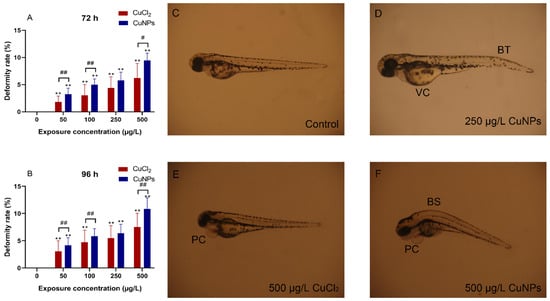 Deformity rate of zebrafish embryos exposed to CuCl2 and CuNPs for 96 h. (A) Dose-related variations in zebrafish embryo malformations at 72 h. (B) Dose-related variations in zebrafish embryo malformations at 96 h (except for 100 µg/L CuNPs group). (C–F) Representative optical images of deformed zebrafish. Data are mean ± SD, N = 60. ** Denotes significant difference versus the control (p < 0.01). # Denotes significant difference between CuCl2 and CuNPs groups (# p < 0.05, ## p < 0.01). The typical malformations including bent tail (BT), bent spine (BS), pericardial cyst (PC), and vitelline cyst (VC).