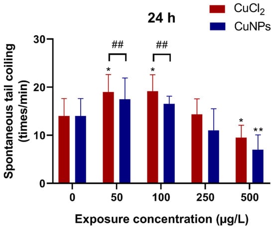 Spontaneous tail coiling of zebrafish embryos after treatment with different concentrations of CuCl2 and CuNPs for 24 h. Data are mean ± SD, N = 60. * Denotes significant difference versus the control (* p < 0.05, ** p < 0.01). ## Denotes significant difference between CuCl2 and CuNPs groups (p < 0.01).