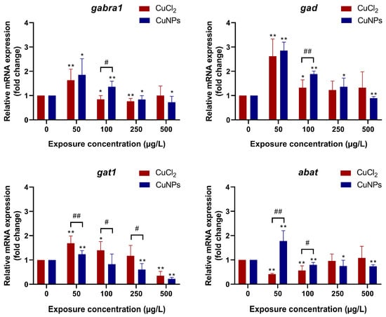 mRNA expression of GABA signaling pathway-related genes in zebrafish embryos after treatment with different concentrations of CuCl2 and CuNPs for 96 h. The experiment was performed in sextuplicate with N = 30 for each treatment. Data are mean ± SD. * D significant difference versus the control (* p < 0.05, ** p < 0.01). # Denotes significant difference between CuCl2 and CuNPs groups (# p < 0.05, ## p < 0.01).