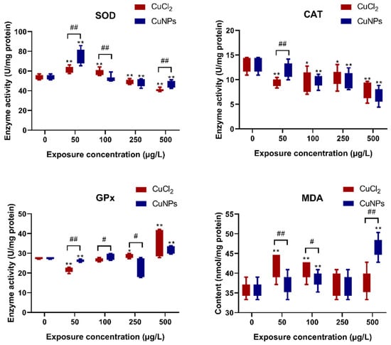 Activity of antioxidative enzymes in zebrafish embryos after treatment with different concentrations of CuCl2 and CuNPs for 96 h. The experiment was performed in triplicate with N = 60 for each treatment. Data are mean ± SD. * Denotes significant difference versus the control (* p < 0.05, ** p < 0.01). # Denotes significant difference between CuCl2 and CuNPs groups (# p < 0.05, ## p < 0.01).