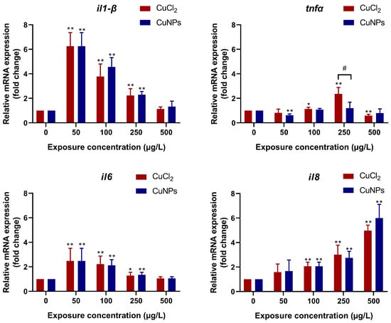mRNA expression of inflammatory factors in zebrafish embryos after treatment with different concentrations of CuCl2 and CuNPs for 96 h. The experiment was performed in sextuplicate with N = 30 for each treatment. Data are mean ± SD. * Denotes significant difference versus the control (* p < 0.05, ** p < 0.01). # Denotes significant difference between CuCl2 and CuNPs groups (p < 0.05).
