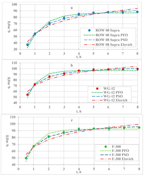 The obtained adsorption kinetics results were described using the PFO, PSO, and Elovich models (Table 2). The best fit of the study results, assessed on the basis of R2 and E, was obtained for the PSO model (R2 ranging from 0.995 to 0.996 and ARE ranging from 1.11 to 1.37%). The PFO and PSO models were semi-empirical and it was difficult to suggest an adsorption mechanism on their basis. The PSO model suggests the importance of chemisorption. The adsorption rate determined by the k1 coefficient was similar on the studied microporous activated carbons; it was 0.016 h−1 for ROW 08 Supra and 0.019 h−1 for F-300 and WG-12. In the case of the other two models analysed, it was not possible to determine unequivocally which one described the study results better, as it depended on the sorbent used. However, they described the test results with a fairly high degree of accuracy, with R2 ranging from 0.942 to 0.981. Most of the studies reported in the literature use the PFO and PSO models, but the PSO model is usually the one that better describes the results of adsorption kinetics studies (Table 2).