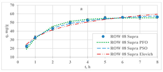 In this study, the adsorption kinetics was analysed and three models were used to describe it: PSO, PFO, and Elovich. The PFO and PSO models are semi-empirical but are most commonly used to describe the adsorption kinetics on activated carbons. In this study, in almost all cases, the PSO model was a better fit for the results obtained than PFO and Elovich.