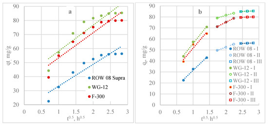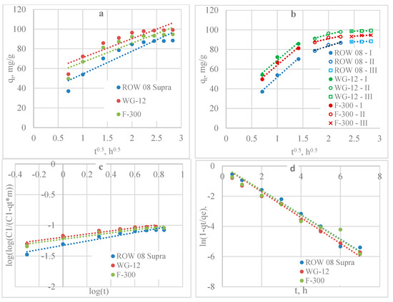 The Weber-Morris model assumes that the adsorption process is controlled by intraparticle diffusion if the graph of qt(t1/2) is a straight line and passes through the origin of the coordinate system. The graphs of the relationship qt(t1/2) for both Pb(II) (Figure 3a) and Cd(II) ions (Figure 4a) do not pass through the origin of the coordinate system and are characterised by low values of R2 (R2 from 0.8297 to 0.8657 for Pb(II) and from 0.8624 to 0.8876 for Cd(II)) (Table 3 and Table 4). This indicates that intraparticle diffusion is not the only phase limiting the adsorption rate.