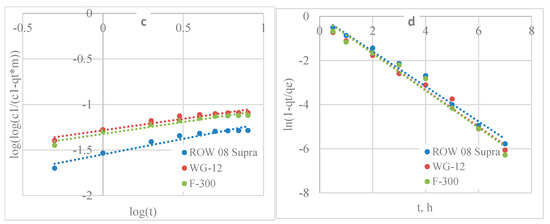 A liquid film diffusion model was also analysed (Figure 3d and Figure 4d, Table 3 and Table 4). This model with a high R2 (0.9497 to 0.9841 for Pb(II) and 0.9737 to 0.9840 for Cd(II)) describes the mass transfer of lead and cadmium ions on all activated carbons. These results confirm the significant influence of liquid film diffusion on adsorption kinetics.