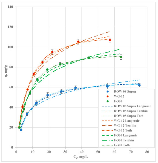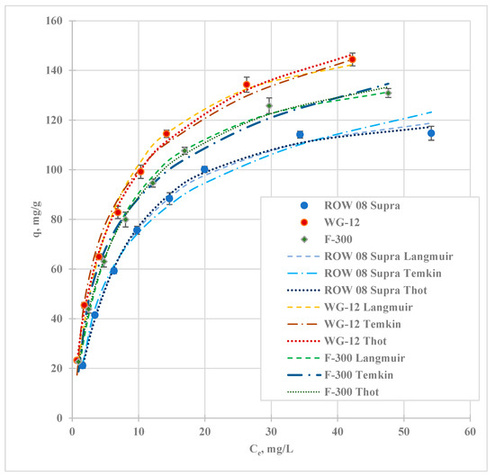 The Langmuir, Toth, and Jovanovic isotherm models can be used to determine the capacity of the monolayer. Based on the qm values (the Langmuir model), the carbons can be arranged as follows: WG-12 > F-300 > ROW 08 Supra (qm ranging from 135.94 to 162.19 mg/g). The qm values from the Langmuir isotherm are similar for all carbons. The qm values from the Toth model differ to a much greater extent (qm ranging from 127.6 for ROW 08 Supra to 209.83 mg/g for WG-12). The qm values determined using the Jovanovic model are lower and range from 113.89 (for ROW 08 Supra) to 137.85 mg/g (for WG-12). Analysing the KL values, it can be concluded that the highest affinity of lead ions to the surface was obtained for WG-12 activated carbon and the lowest for ROW 08 Supra. The calculated RL values prove that the adsorption of lead ions is favourable on the commercial activated carbons used in the study (RL = 0.9 ÷ 0.99).