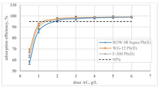 The effect of doses on the adsorption efficiency was also analysed (Figure 6). The lowest of the analysed doses (0.5 g/L) resulted in the removal of 57% w/w of Pb(II) ions for ROW 08 Supra activated, carbon, 63% w/w for F-300, and 68% w/w for WG-12. A dose of 2 g/L resulted in more than 95% w/w removal of the analysed ions on all activated carbons.