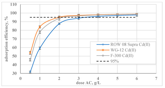 The effect of doses on the adsorption efficiency of cadmium ions was also assessed (Figure 8). The lowest of the analysed doses (0.5 g/L) resulted in the removal of 32% w/w of Cd(II) ions for ROW 08 Supra activated carbon, 46% w/w for F-300, and 54% w/w for WG-12. A dose of 2 g/L of WG-12 activated carbon resulted in more than 95% removal of cadmium ions. For the other activated carbons, the doses had to be higher, e.g., 3 g for F-300 and 4 g for ROW 08 Supra.
