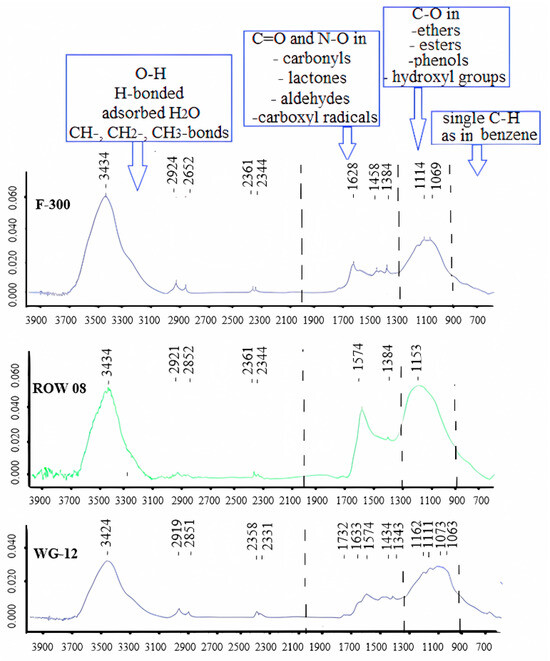 In the first stage of the lead adsorption study, the adsorption kinetics were analysed (Figure 1, Table 1). The removal of the Pb(II) cation was fastest in the first stage of the process. After 1 h, the adsorption efficiency of lead ions ranged from 39.7% w/w (F-300) to 57.8% w/w (WG-12). After 8 h, the adsorption efficiency ranged from 70.7% w/w (ROW 08 Supra) to 79.4% w/w (WG-12). The adsorption kinetics were fast in the first stage of the process, as readily available active sites were used.