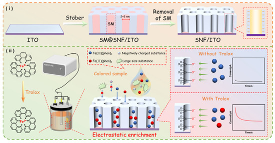 Schematic illustration for the preparation of the SNF-modified ITO electrode (i) and electrochemical determination of TAC (ii) using nanochannel-based enrichment of Fe(II)(phen)3.