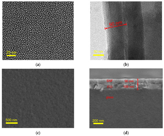 (a,b) Top-view and cross-sectional TEM images of SNF. (c,d) SEM image of the surface and the cross-section of SNF/ITO.