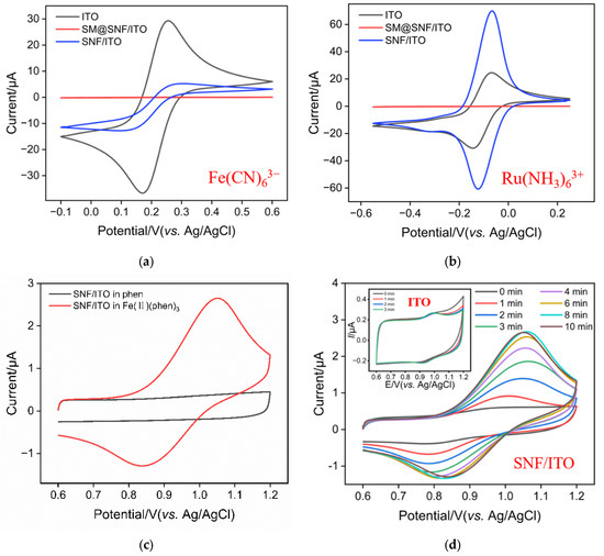 To investigate the oxidation–reduction potential of Fe(II)(phen)3, CV curves obtained on SNF/ITO electrodes in phenanthroline or Fe(II)(phen)3 solution were investigated. As shown in Figure 3c, a significant Faradaic current is observed in the Fe(II)(phen)3 solution, while there was almost no Faradaic current in the phenanthroline solution. This confirms that the redox peaks originate from the oxidation of iron atoms in the complex. From the CV curve, it can also be seen that the oxidation reaction of Fe(II)(phen)3 occurs at approximately 0.7 V and reaches its peak current at around 1.05 V.