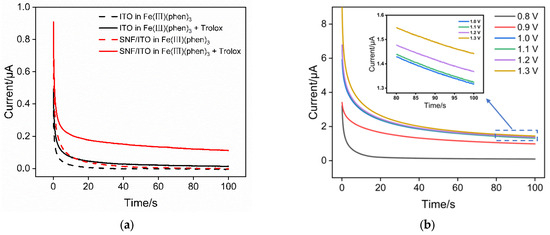 (a) I–t curves obtained on ITO or SNF/ITO in Fe(III)(phen)3 (2 mM) with or without Trolox (1 μM). (b) I–t curves obtained on SNF/ITO by applying different potentials in Fe(III)(phen)3 solution containing 100 μM Trolox.