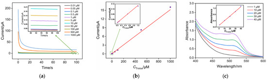 (a) I–t curves obtained on SNF/ITO electrodes in Fe(III)(phen)3 (2 mM) with different concentrations of Trolox. Inset is a magnified view of the I–t curve in the low concentration region. (b) Calibration curves for Trolox determination. Inset shows a magnified view at low concentrations. (c) Spectra obtained for determination of different concentrations of Trolox using the colorimetric method. Inset is the corresponding linear regression curve. Error bars represent the standard deviations of three measurements.