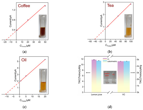 The linear relationship obtained for analysis coffee (a), tea (b), and sesame oil (c) samples. Inset in each figure displays photograph of the analyzed samples. (d) TAC of VC tablets or lemon detected by the I–t method using the fabricated sensor or standard colorimetric method. The inset shows the digital photo of the detected solution. TAC was calculated according to the weight of the original VC tablet or lemon.