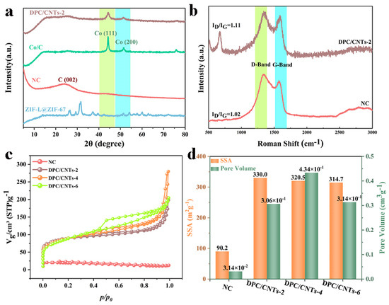 (a) XRD, (b) Raman spectra (c), N2 adsorption–desorption isotherms, and (d) corresponding SSAs and pore volumes of the ZIF-L@ZIF-67, NC, Co/C, and DPC/CNTs composites.