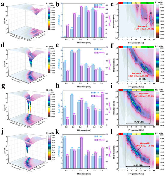 The RL and EAB values for NC and DPC/CNTs composites under a filling rate of 12 wt%, (a–c) NC, (d–f) DPC/CNTs-2, (g–i) DPC/CNTs-4, and (j–l) DPC/CNTs-6.