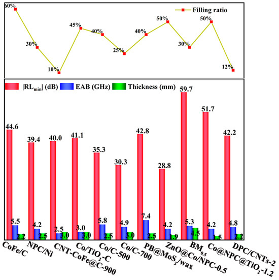 The MA performance of DPC/CNTs-2 was compared with other previously reported MOF-based nanomaterials in terms of the filling rate, thickness, minimum RL value, and EAB [26,45,46,47,48,49,50,51,52] (Figure 4). The results indicate that almost all Co-based MOF materials exhibit excellent MA performance, among them, BM 0.5 and Co@NPC@TiO2 achieve RLmin values of −59.7 and −51.7, respectively, due to their outstanding structural and compositional design. PB@MoS2/wax, benefiting from the synergistic interaction between different components, achieves an absorption bandwidth of 7.4 GHz. However, most of the materials have loading amounts above 30 wt%, and the DPC/CNTs-2 in our work demonstrates a high absorption peak and a wide effective absorption bandwidth at 12 wt% loading amount, which highlights its enormous potential as a high-performance MA material.