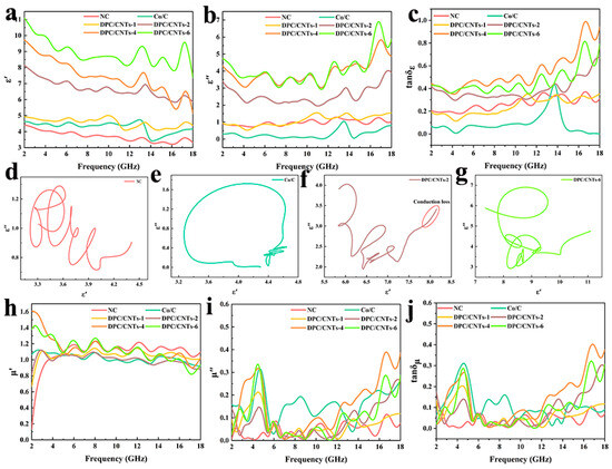 Figure 5d–g shows the Cole curves of the NC, Co/C, and DPC/CNTs. Following Debye’s theory, the relation between ε′ and ε″ is shown in Equation (3):