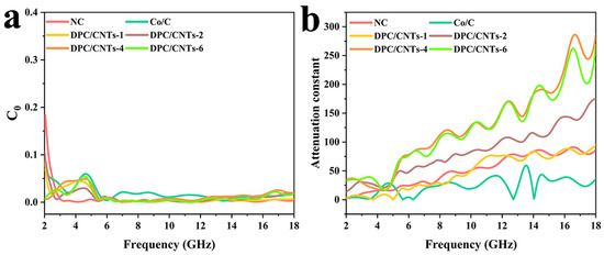 As demonstrated in Figure 6b, the alpha curves of all samples display a comparable pattern at the examined frequencies. Specifically, due to relatively weak dielectric and magnetic loss capabilities, NC and Co/C have the lowest α values among these six samples. For the DPC/CNTs composites, the trend of attenuation constant with the change in the ZIF-67 loading is consistent with the ε″ values, further confirming the predominant role of the dielectric loss in the attenuation mechanism of DPC/CNTs. The continuously increasing attenuation constant also explains the excellent high-frequency MA performance of the DPC/CNTs composites.