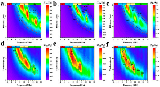 Permeability is another important parameter that affects the performance of MA, in the same way as the dielectric constant. As seen in Figure 5h–j, within the range of 6–18 GHz, the μ′ and μ″ of all samples vary between 1.0–1.2 and 0–0.4, respectively. The corresponding average tanδμ is around 0.2, which is significantly smaller than the tanδε, indicating that the dielectric loss is the primary factor influencing the MA property. Magnetic loss is typically attributed to eddy current effects and the natural and exchange resonances. Multiple resonance peaks in the μ″ curve suggest the presence of natural and exchange resonances, diminishing the electromagnetic energy. Concerning the eddy current effects, if the value of C0 (C0 = μ″ (μ′) − 2f−1) remains constant, magnetic loss will occur [59]. As shown in Figure 6a, the fluctuating nature of C0 for all the samples in the range of 6 to 18 GHz indicates the presence of eddy current losses [60].