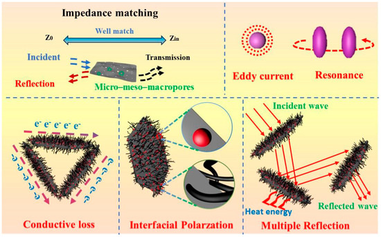 Figure 8 provides an overview of the MA mechanism of the layered spiral DPC/CNTs composites. Firstly, electromagnetic waves are reflected, transmitted, or absorbed when they reach the surface of the microwave absorber. The abundant microporous structure and high specific surface area can effectively reduce the complex dielectric constant, enhancing the impedance matching of the MA materials, allowing more microwaves to pass into the material and broaden its absorption bandwidth [43]. Secondly, the Co atoms present in the material contribute to eddy current loss and resonance loss [63,64]. Thirdly, the uniformly sized carbon-based matrix layers overlap to form a conductive network, facilitating electron transfer and converting electromagnetic energy into heat, enhancing the material’s dielectric loss [65]. Fourth, the interface between the Co ions and self-generated carbon nanotubes with the carbon matrix promotes the generation of interface polarization [66]. Finally, multiple reflections occur between the layers and within the mesopores, thereby enhancing its attenuation ability [55].