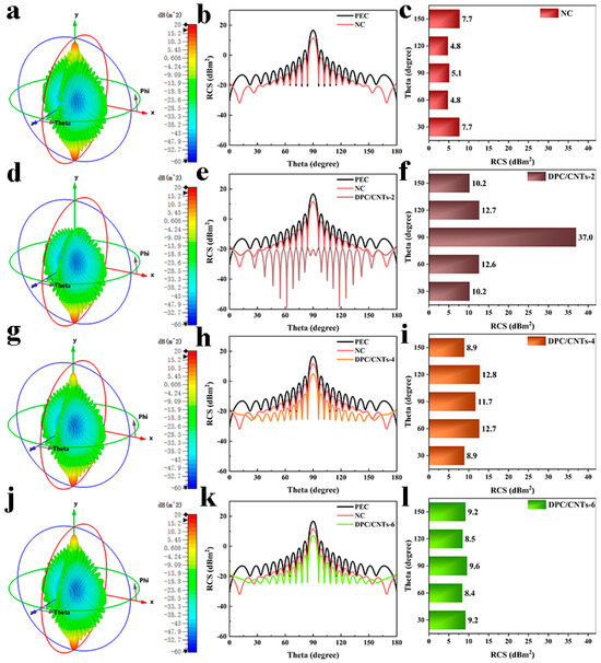 (a,d,g,j) CST simulation results based on the far-field response of NC, DPC/CNTs-2, DPC/CNTs-4, and DPC/CNTs-6. (b,e,h,k) RCS simulated curves of NC, DPC/CNTs-2, DPC/CNTs-4, and DPC/CNTs-6. (c,f,i,l) RCS reductions achieved by subtracting the NC, DPC/CNTs-2, DPC/CNTs-4, and DPC/CNTs-6.