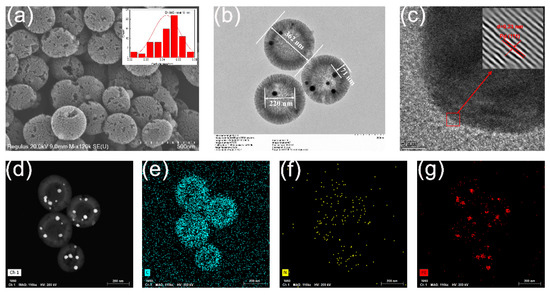 (a) SEM (inset: size distribution), (b) TEM, (c) HRTEM, and (d–g) elemental mapping images of Pd/MCHS nanocomposite.