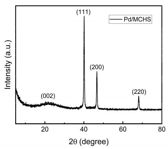 The crystal structure of the Pd/MCHS nanocomposite was examined by XRD, and the results are shown in Figure 2. The sample exhibits a distinct diffraction peak at 24.6°, which is attributed to the (002) facet of graphitic carbon, confirming the presence of an amorphous structure. Furthermore, the fcc structure of the Pd crystal is confirmed by the diffraction peaks at 40.0°, 46.0°, and 68.0°, corresponding to the (111), (200), and (220) facets, respectively [43].