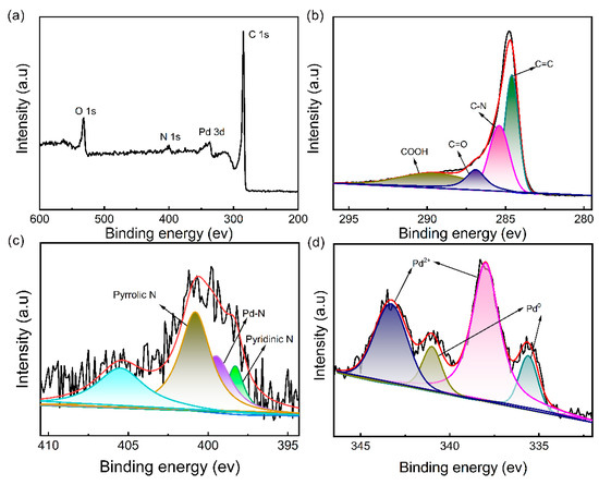 XPS was employed to further verify the successful fabrication of the Pd/MCHS nanocomposite. The peaks corresponding to C, N, and Pd are evident in the XPS spectrum of nanocomposite (Figure 3a). The results were consistent with the EDS elemental mapping. The high-resolution C 1s spectrum shows distinct peaks corresponding to different carbon bonds: sp2 C=C at 284.6 eV, C-N at 285.4 eV, C=O at 286.9 eV, and COOH at 289.5 eV (Figure 3b). Furthermore, the N 1s spectra exhibits discernible peaks representing pyridinic N (397.58 eV), Pd–N (399.5 eV), pyrrolic N (400.54 eV), and oxidized nitrogen species (405.3 eV) (Figure 3c). Notably, the interaction between pyridine N and Pd nanoparticles (Pd–N) is strong, which is ascribed to the more negative charges and diffuse orbitals associated with pyridine N. This interaction can effectively prevent the agglomeration of Pd nanoparticles, thereby enhancing the electrocatalytic activity and stability of the Pd/MCHS nanocomposite. The Pd 2p spectrum reveals a pair of peaks at 335.6 and 341.0 eV, which correspond to the metallic Pd (PdO) in the Pd/MCHS nanocomposite. Additionally, the peaks at 338.0 and 343.3 eV are attributed to the Pd–N interaction or PdO species (Figure 3d) [39].
