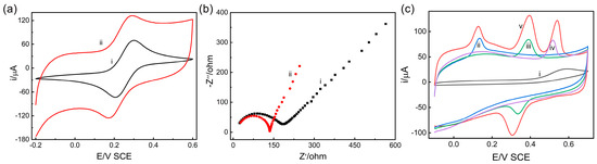 CV (a) and EIS (b) curves of GCE and Pd/MCHS GCE sensor in 0.1 M of KCl solution containing 5 mM [Fe(CN)6]3−/4−: (i) bare GCE; (ii) Pd/MCHS/GCE sensor. (c) CV curves of 1000 µM AA (ii), 40 µM DA (iii), 80 µM UA (iv), and mixed solution of 1000 µM AA, 40 µM DA, 80 µM UA in 0.1 M PBS (pH 3.0) at GCE (i) and Pd/MCHS/GCE sensor (v).