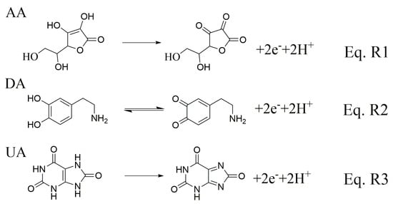- Colín-Orozco, E.; Corona-Avendaño, S.; Ramirez-Sílva, M.T.; Romero-Romo, M.; Palomar-Pardavé, M. On the electrochemical oxidation of dopamine, ascorbic acid and uric acid onto a bare carbon paste electrode from a 0.1 M NaCl aqueous solution at pH 7. Int. J. Electrochem. Sci. 2012, 7, 6097–6105. [Google Scholar] [CrossRef]