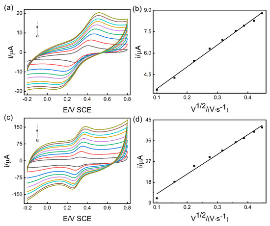 The dynamic surface area of GCE and the Pd/MCHS/GCE sensor was calculated by using Randles–Sevcik equation (Ip = (2.69 × 105) n3/2A D01/2v1/2c0∗) (where n is the number of electrons involved in the reaction, i.e., equal to 1, A is effective area of electrode, D0 is diffusion coefficient (for K3[Fe(CN)6] is 7.6 × 10−6 cm2/s, v is scan rate and c0∗ is concentration of K3[Fe(CN)6] (1.0 mM)). From the slope of the plot seen in Figure 6, Ip = f (v1/2), the effective surface area of GCE and the Pd/MCHS/GCE sensor were found to be 0.0206 and 0.115 cm2. The effective surface area of the proposed sensor was obviously increased, which is conducive to the enrichment of target molecules on the sensor, the occurrence of electrochemical reactions, and the sensitive detection of small biological molecules [46,47,48].