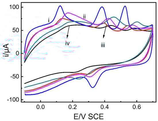 Effect of supporting electrolyte type on the sensor response: (i) PBS, (ii) citric acid-sodium citrate buffer solution, (iii) Britton–Robinson (B–R) solution, (iv) ABS, and (v) glycine-hydrochloric acid buffer solution.