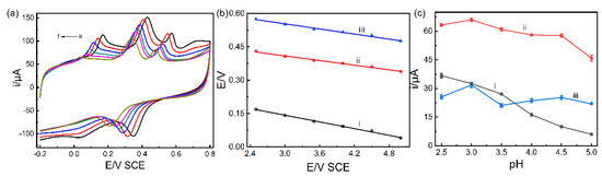 (a) CV curves for the oxidation of AA (1000 μM), DA (40 μM), and UA (80 μM) on the Pd/MCHS/GCE sensor under various pH values ranging from 2.5 to 5 (a–f); (b) influence of pH on the oxidation peak potentials; (c) influence of pH on the oxidation peak current: (i) AA; (ii) DA, and (iii) UA.