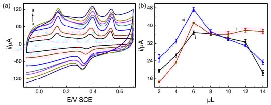 (a) CV curves for the oxidation of AA (1000 μM), DA (40 μM), and UA (80 μM) on the Pd/MCHS/GCE sensor under different amounts of modifier ranging from 2 µL to 14 µL (a–g). (b) Effect of the amount of Pd/MCHS dispersion on the oxidation peak current: (i) AA, (ii) DA, and (iii) UA.