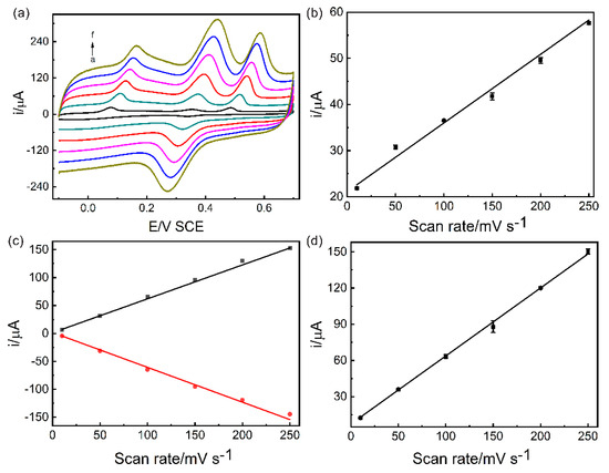 (a) CV curves of Pd/MCHS/GCE sensor in PBS (pH = 3.0, 0.1 M) containing 1000 μM AA, 40 μM DA, and 80 μM UA under scan rates from 10 to 250 mV·s−1 (a–f). A linear relationship is observed between the oxidation peak current and scan rates: (b) AA, (c) DA, and (d) UA.