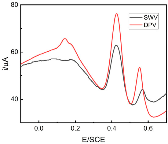 In order to select the best technique method, square wave voltammetry (SWV) and differential pulse voltammetry (DPV) were used to investigate the effects of the Pd/MCHS/GCE sensor with an AA, DA and UA mixed solution, and the obtained signals are shown in Figure 11. The working parameters of SWV were as follows: the amplitude was 25 mV, the frequency was 15 Hz; the DPV had an amplitude of 50 mV and a pulse width of 200 mV. Because the three compounds exhibited higher peak currents and better peak shape in when separated further and further, DPV was used to analyze AA, DA, and UA in the following experiments.