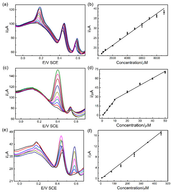DPV with high sensitivity and resolution was employed for the determination of AA, DA, and UA under optimal conditions. As depicted in Figure 12a,c,e, when keeping the concentrations of the two analytes constant while increasing the concentration of the third analyte, a consistent variation in the peak current value of the third analyte was observed. As seen in Figure 12b,d,f, the linear relationship between the peak current value (Ip) and concentration (C) can be described by the following equations: Ip (µA) = 0.00269 CAA (µM) + 15.940, Ip (µA) = 2.644 CDA (µM) − 1.757, Ip (µA) = 1.145 CDA (µM) + 14.436, and Ip (µA) = −0.198 CUA (µM) + 0.039. The limit of detection (LOD) values were calculated to be 31.10, 0.036, and 5.00 µM, respectively.