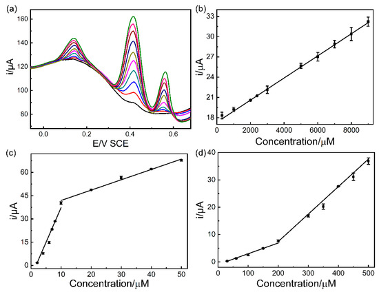 Furthermore, the concurrent detection of AA, DA and UA with different concentrations was thoroughly examined under the optimal experimental conditions. Figure 13 shows the variation in the current response as a function of the concentrations of AA, DA, and UA. The linear concentration ranges for AA, DA, and UA were determined to be 300–9000 µM, 2–50 µM, and 20–500 µM, with LOD values of 51.00, 0.14, and 4.96 µM, respectively. These findings demonstrated that the Pd/MCHS/GCE sensor can accurately determine AA, DA, and UA.