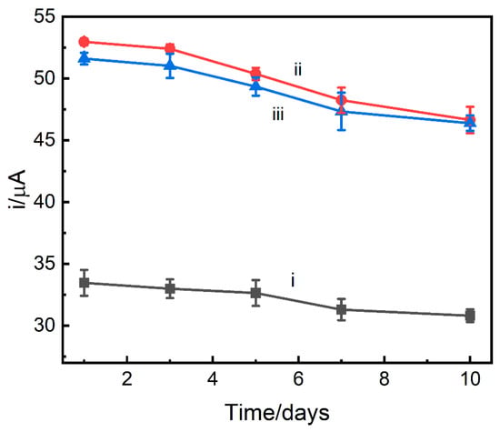 Stability of Pd/MCHS/GCE sensor toward 1000 μM AA (i), 40 μM DA (ii), and 80 μM UA (iii) for 10 days.