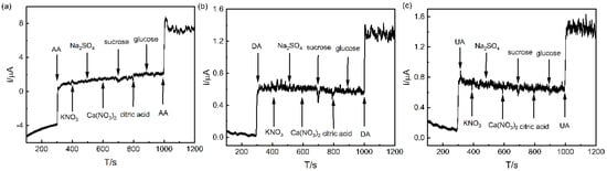 To confirm the high selectivity of the Pd/MCHS/GCE sensor for the determination of AA, DA, and UA, the recognition performance of the sensor for different substances (KNO3, Na2SO4, Ca(NO3)2, sucrose, citric acid, and glucose) was investigated under a voltage of 0.1 V (AA), 0.4 V (DA), and 0.55 V (UA), and the results were shown in Figure 15. Compared to the current signal obtained from AA (1000 µM), DA (30 µM), and UA (30 µM), the interfering species (2000 µM) do not induce an obvious current response. Due to the attractive electronic properties and high catalytic activity of the Pd/MCHS nanocomposite, it can provide electron tunneling, enabling electrons to transfer between the active site of the nanocomposite and the Pd/MCHS/GCE sensor, and can selectively improve the mass diffusion of the target molecule, so that the constructed electrochemical sensor shows a highly sensitive and selective electrochemical sensing performance in the detection of AA, DA and UA.