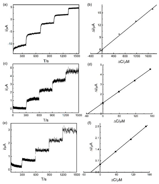 The amperometry method is an electrochemical method for the quantitative analysis of electrochemically active substances by applying a constant potential to the study electrode. Because this method can maintain constant potential and reduce the influence of the double layer charging current, it is often used to detect real samples. Therefore, it was used to detect AA, DA, and UA in a vitamin C tablet, DA injection, and human urine to assess the practical feasibility of the Pd/MCHS/GCE sensor. The specific parameters were set as follows: the initial potential was 0.55 V, the sampling interval was 0.1 s, and the sampling time was 1600 s. As shown in Figure 16, the recoveries were calculated based on the relationship between ΔC and ΔI. The average recoveries of AA, DA, and UA in the Pd/MCHS/GCE sensor were 99.8–110.9%, 99.04–100.45%, and 98.80–100.49%, respectively.